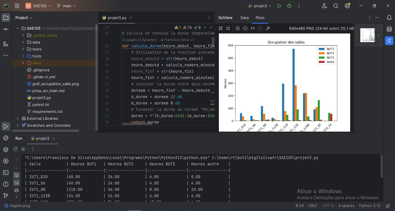 Le but de cette SAÉ est de produire une solution informatique concrète pour une entreprise. Dans mon cas, il s'agissait d'aider les services administratifs à mesurer l’utilisation des salles par année. En tant que futur professionnel R&T, je serai régulièrement amené à traiter des données provenant du système d’information de mon entreprise, telles que l'extraction d’informations comptables, pour les présenter efficacement à ma hiérarchie ou à mes collègues. Ces traitements, pouvant être récurrents, gagnent à être automatisés par des programmes ou des scripts informatiques pour une gestion efficiente.